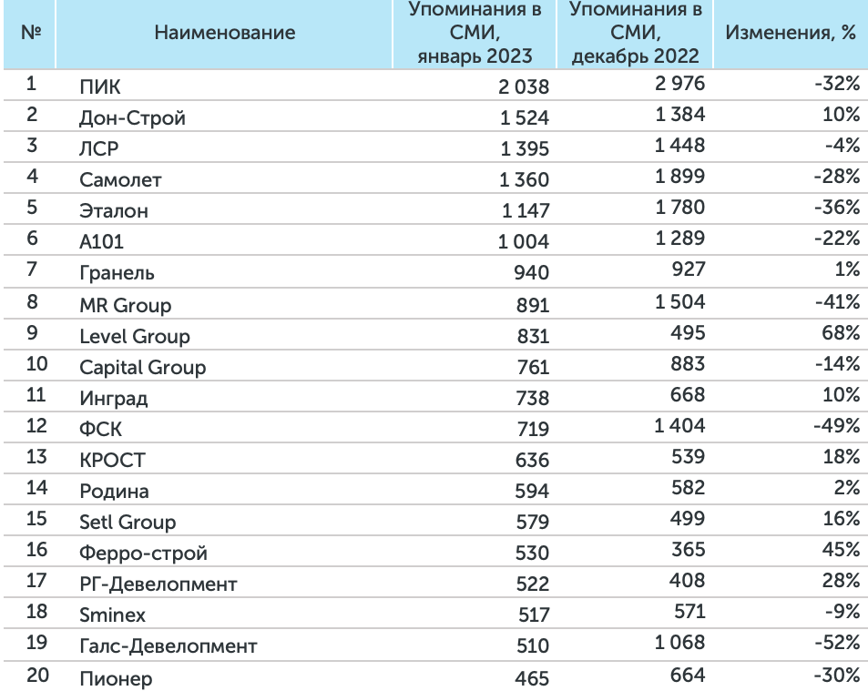 Система мониторинга и анализа СМИ и соцмедиа СКАН-Интерфакс совместно с онлайн-порталом «Строительной газеты» подготовили медиарейтинг девелоперов за первый месяц 2023 года. В январе 2023 года на высших строчках рейтинга сохранили свое присутствие ГК «ПИК», «Донстрой» и ГК «Эталон». Кроме того, в топ-3 вновь вошли «Группа ЛСР» и ГК «Страна Девелопмент». Снижение медиапоказателей в январе у большинства компаний частично объясняется тем, что январь традиционно является самым коротким рабочим месяцем в году.
