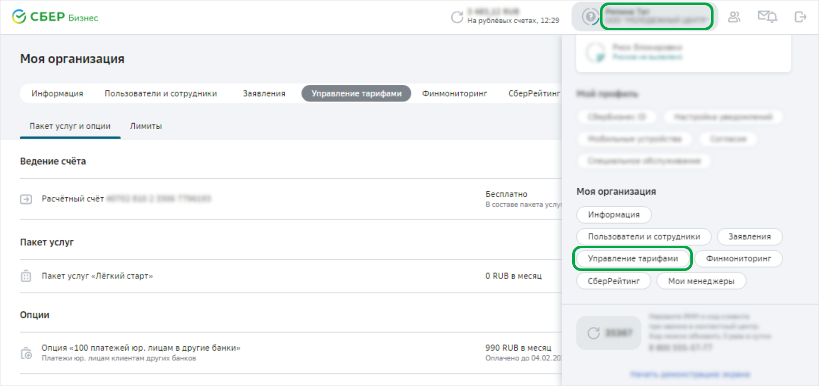 Для начала проверьте, входят ли в ваш пакет услуг небанковские сервисы. В правом верхнем углу экрана кликните на название организации, далее из блока Моя организация в правом нижнем углу экрана перейдите в раздел Управление тарифами.