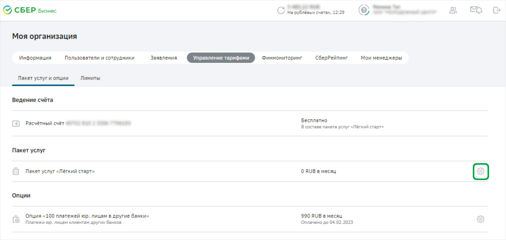Чтобы подключить пакет услуг/опцию, заполните заявление в интернет-банке СберБизнес, в разделе Управление тарифами. Из появившегося списка счетов выберите тот, для которого хотите подключить пакет услуг или опцию, затем нажмите на значок шестерёнки. В открывшемся окне нажмите на кнопку подключения напротив надписи «Пакет услуг не подключён» или напротив интересующей опции. Подать заявление может уполномоченное лицо — единоличный исполнительный орган организации (ЕИО) или ИП. Если вы открыли новый расчётный счёт, подключили и полностью оплатили пакет услуг, он активируется в тот же день. Если вы подключаете пакет услуг к действующему расчётному счёту без пакета услуг, условия ПУ начнут действовать на следующий день после списания платы. Подключение опций доступно ко всем пакетам услуг, кроме ПУ «Лёгкий старт». Почитайте подробные инструкции, как подключить пакет услуг и как подключить опцию в интернет-банке СберБизнес.